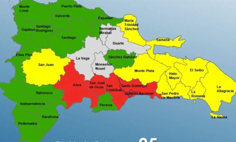 Se mantienen en alerta roja: Azua, San José de Ocoa, San Cristóbal, Santo Domingo y el Distrito Nacional. En alerta amarilla están María Trinidad Sánchez, San Pedro de Macorís, El Seibo, San Juan, Monte Plata, La Altagracia, La Romana, Samaná y Hato Mayor. Mientras que en alerta verde figuran Barahona, Peravia, Montecristi, Dajabón, Santiago Rodríguez, Elías Piña, Puerto Plata, Pedernales, Sánchez Ramírez, Santiago, Bahoruco, Espaillat, Valverde e Independencia.