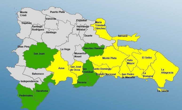 En tanto, en alerta verde están San Juan, Barahona, San Cristóbal, Pedernales, San Juan y Sánchez Ramírez.