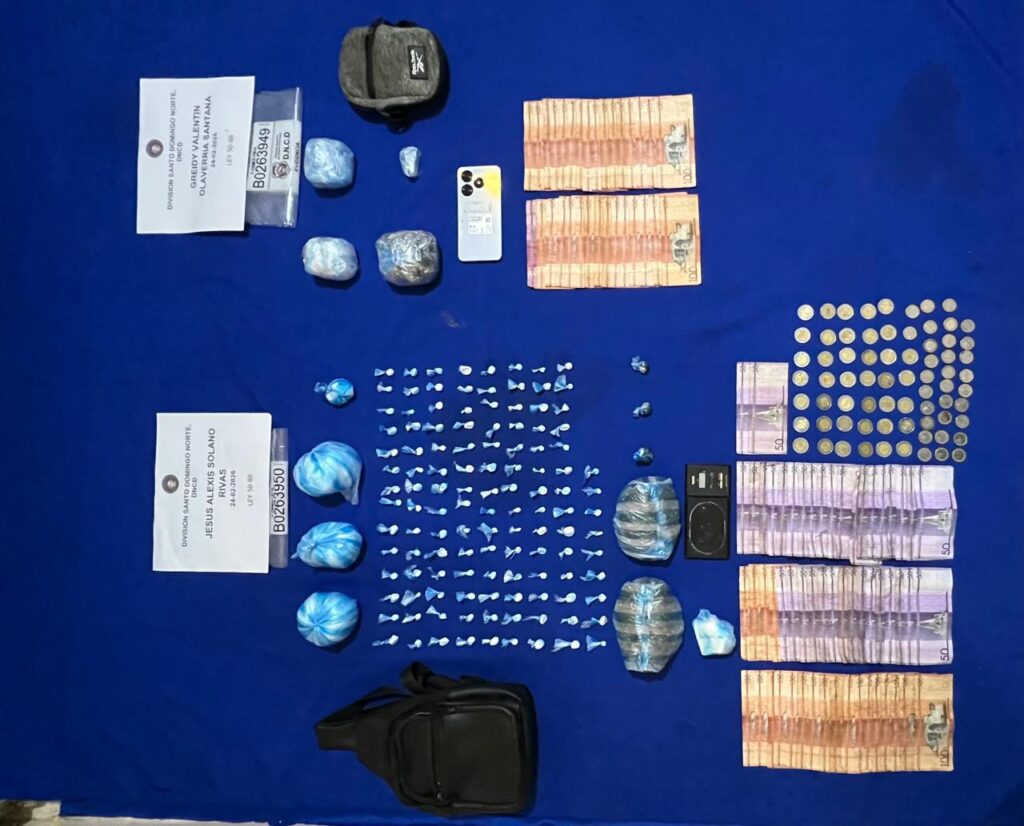 Los detenidos fueron identificados como Greidy Valentín Olaverría Santana y Jesús Alexis Solano Rivas, quienes, según las autoridades, forman parte de la red de microtráfico dirigida por Osvaldo Mojica Prandi, alias “Bebé”, uno de los delincuentes más buscados en el Gran Santo Domingo.