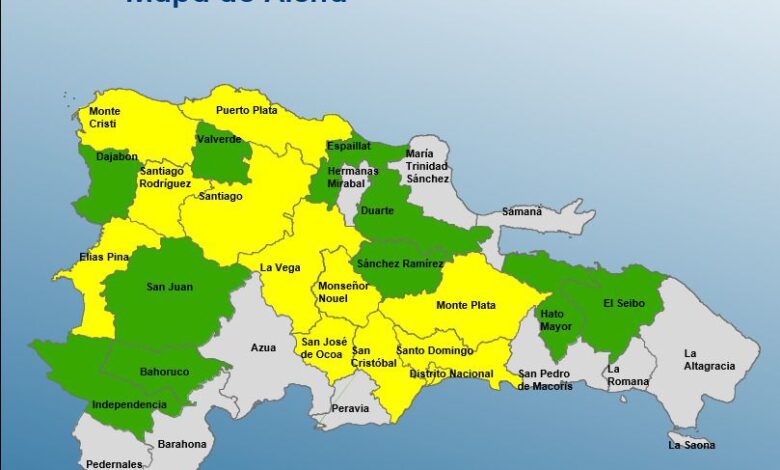 Mientras que en alerta verde se encuentran Hato Mayor, Valverde, Dajabón, Independencia, Sánchez Ramírez, El Seibo, Duarte (especialmente el Bajo Yuna), San Juan, Bahoruco y Espaillat.